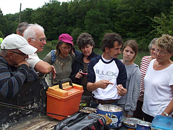 "lancé de mouche" et la confection des appâts. Après quelques tentatives auprès de la faune de l'étang, les personnes