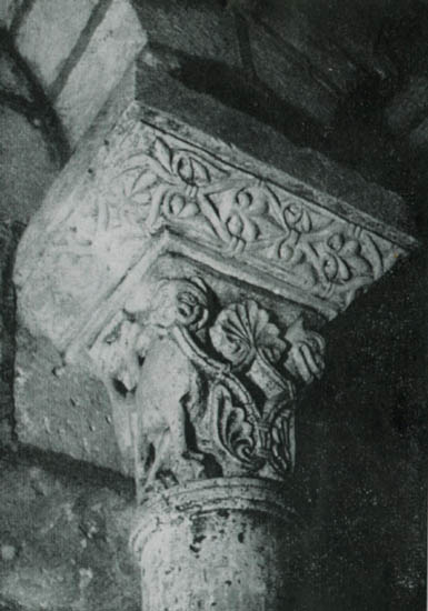 Monstres dont les têtes, logées aux angles, dévorent des rinceaux à palmettes.