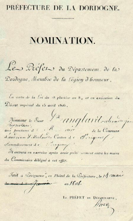 Chancelade et de Merlande à celle de La Chapelle Gonaguet. Il devenait ainsi le dernier Maire de la commune des Andrivaux-Merlande. Mais le 14 mai 1810, il sera nommé Maire de la commune de Chancelade et sera remplacé, en août, par son fils Jean-Baptiste. ![]() Alexandre-Jean DANGLARD avait été nommé Maire des Andrivaux-Merlande par décret impérial en date du 15 avril 1806. Il était caissier des fonds de la fabrique.