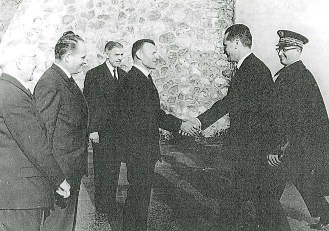 Le Docteur ROUSSEAU, Député de la Dordogne, reçoit Jacques CHABAN-DELMAS, Député Maire de la Gironde pour la remise de la médaille du travail à l'usine BATA de Neuvic le 13 février 1960 en présence du Préfet M. PISSERE.